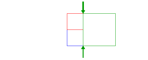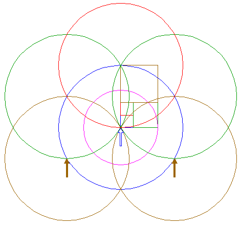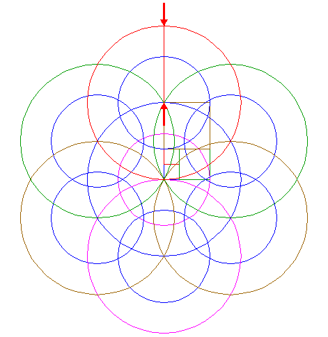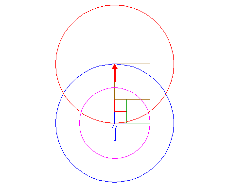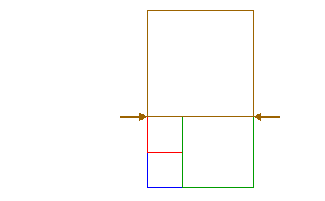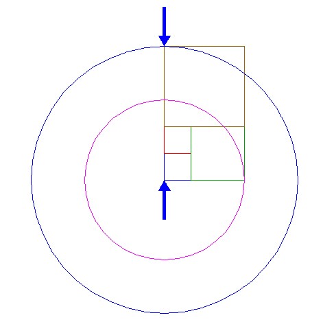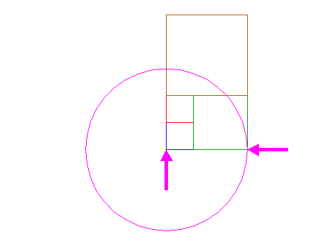 | Construct a square on top of squares 2 and 3, taking their upper sides as its basis. Notice that the sides of squares 1, 2, 3 and 4, and the righthand sides of squares 3 and 4 together, have ratios of 1:1:2:3:5, the first five numbers of the Fibonacci series. Continuing this construction sequence will eventually yield an enclosing rectangle, the sides of which has a ratio of the "Golden Number": 0.618... (For a reference to the nice site of R. Knott about the Fibonacci-series and the Golden Number, see also my construction page for an inscribed pentagon). |