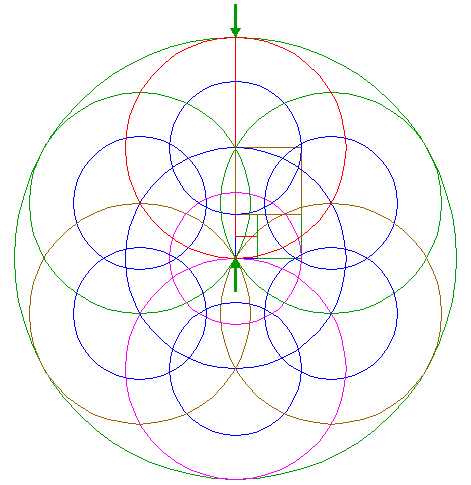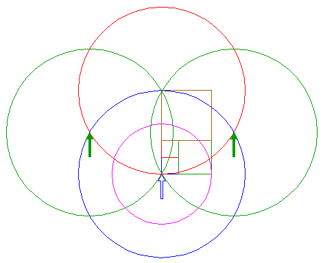 | Copy circle 6 two times, to its both lower intersections with circles 8. |