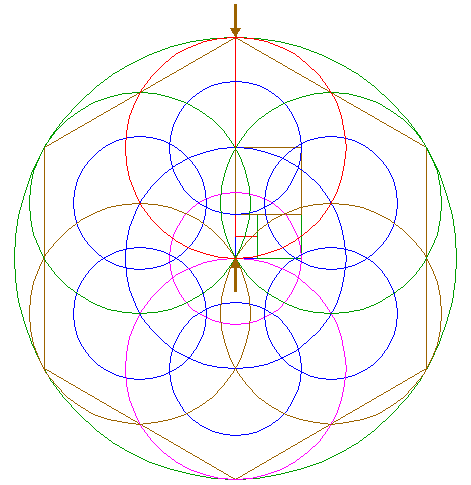 | Copy circles 5 and 6 as a whole six times, to the angular points of hexagon 14. |