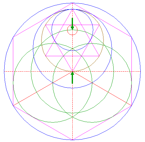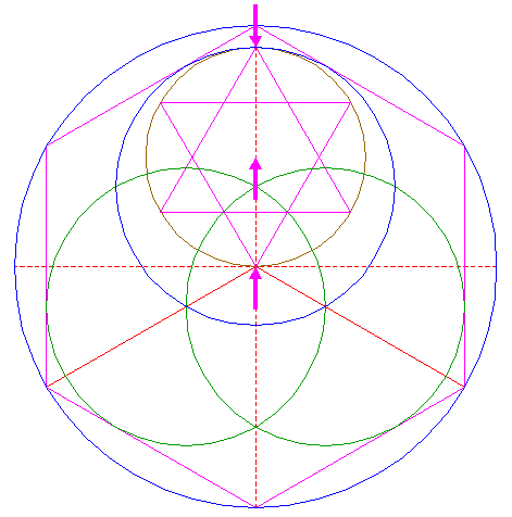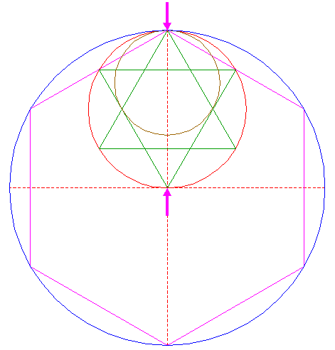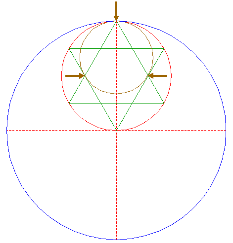 | Create a hexagram, by constructing two inscribed equilateral triangles of circle 9, one pointing up, one pointing down. |