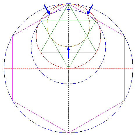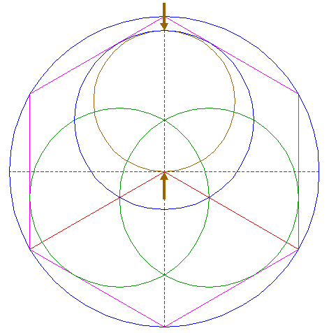 | Construct the inscribed hexagon (regular 6-sided polygon) of circle 1, pointing up. |