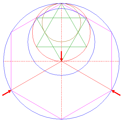 | Draw two rays of hexagon 5, from the center of circle 1 to the lower lefthand and righthand angular points. |