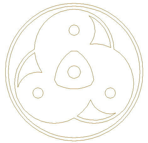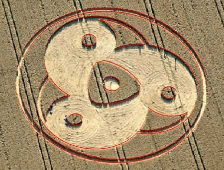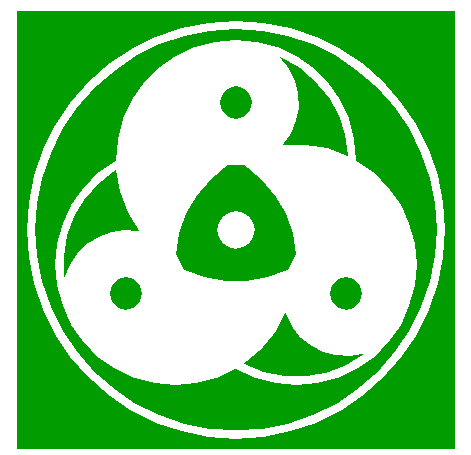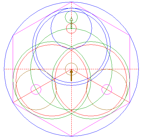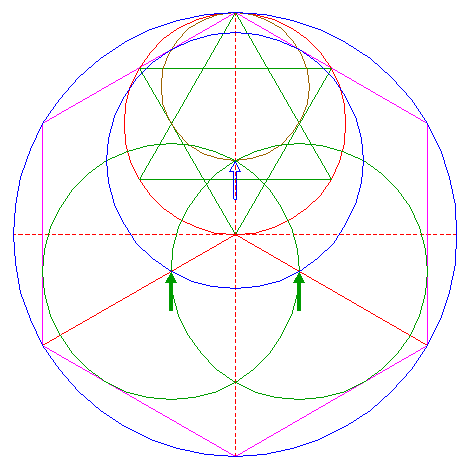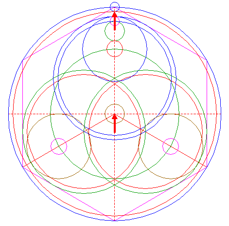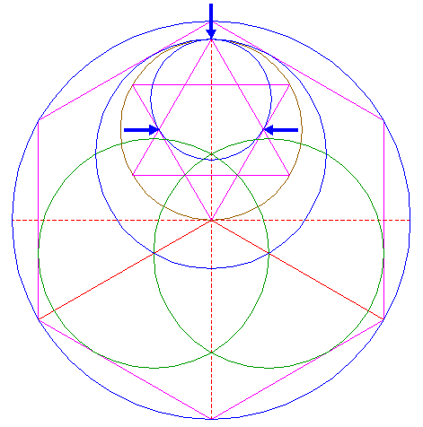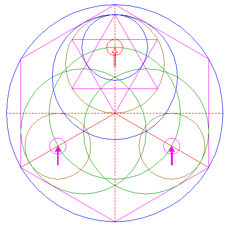 | Construct a circle, passing through the intersections of the lefthand and righthand sides of triangles 3, and passing through the upper intersection of circle 2 and the vertical centerline, as shown. |