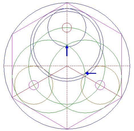 | Construct a circle centered at the upper intersection of circle 16 and the vertical centerline, tangent to circle 6 at the upper side. |