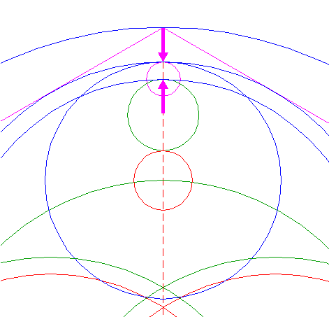 | Construct a "two-points" circle, with the points at the upper intersections of circles 12 and 16 with the vertical centerline. |