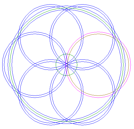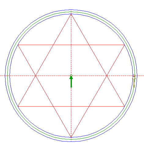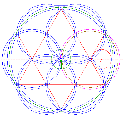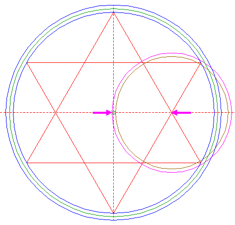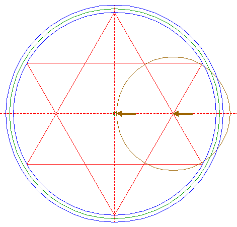 | Construct the inscribed six-pointed star of circle 1, by constructing two inscribed equilateral triangles, one pointing up, one down. |