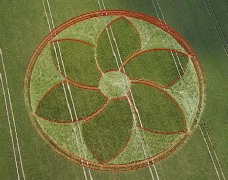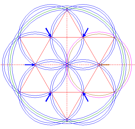 | Copy circles 9 and 10 each five times, to the other mutual intersections of triangles 7. |