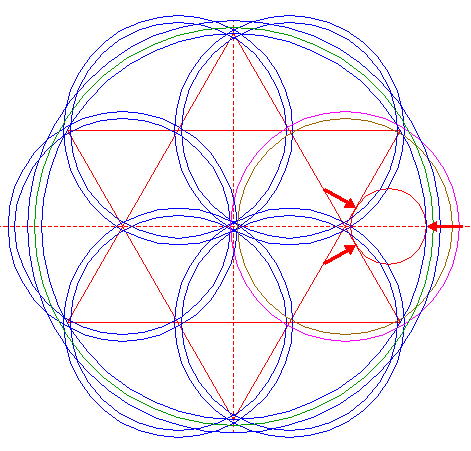 | Construct a circle centered at the righthand mutual intersection of triangles 7, tangent to circle 8 at the righthand side. |