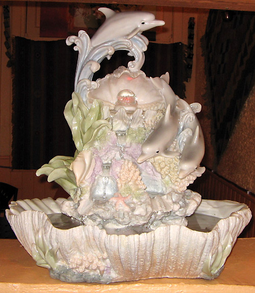 pearl crystal like inside the open shell at the top of the fountain.