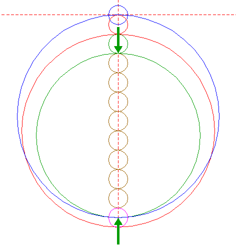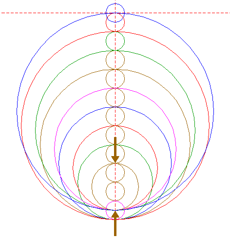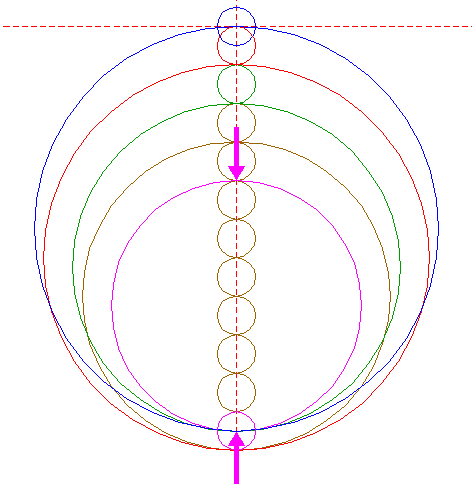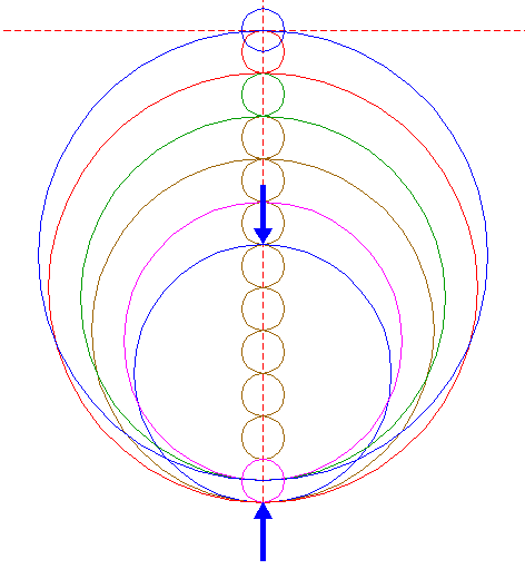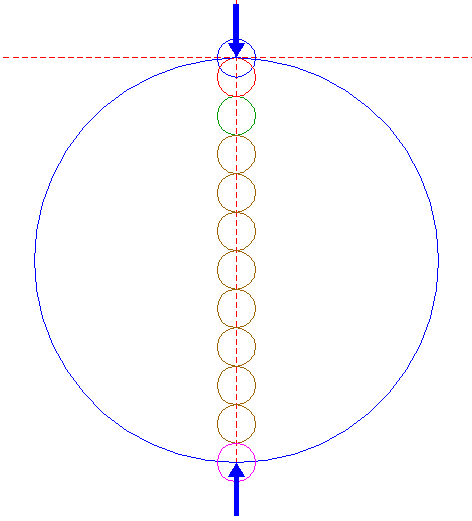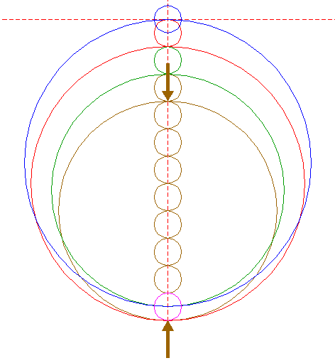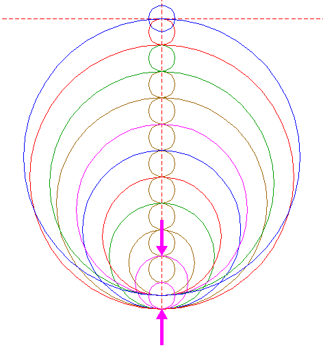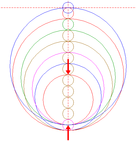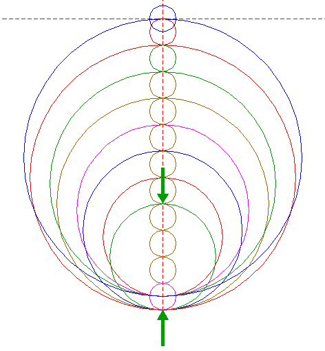 | Construct a two-points circle, with the points at the lower intersections of circles 2 and 5 with the vertical centerline. |