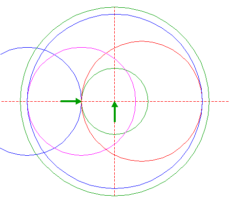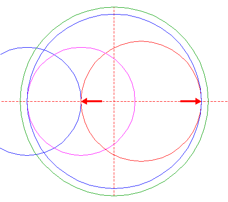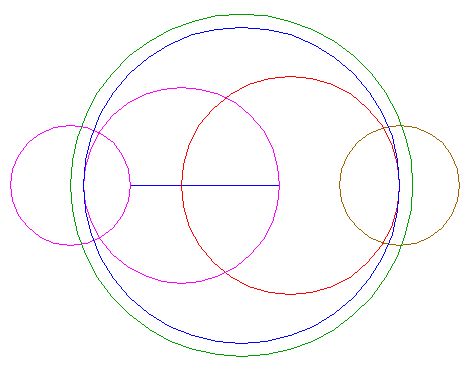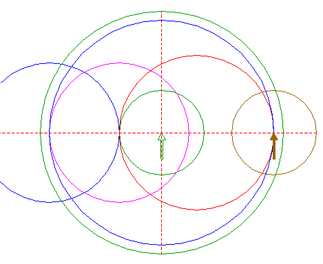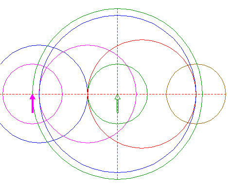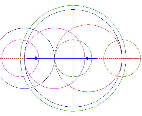 | Construct a "two-points" circle (defined by the end-points of a centerline), by the righthand intersections of circles 1 and 6 with the horizontal centerline. |