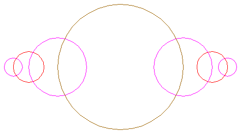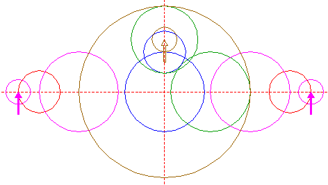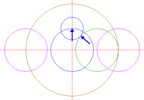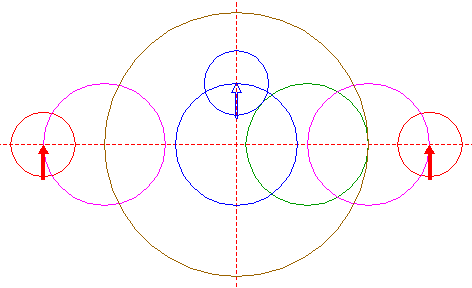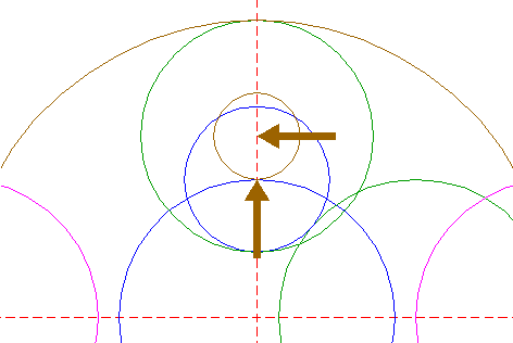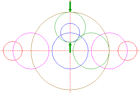 | Construct a "two-points" circle (defined by the end-points of a centerline), defined by the upper intersection of circle 4, and the lower intersection of circle 6, both with the vertical centerline. |