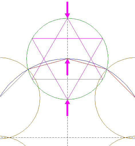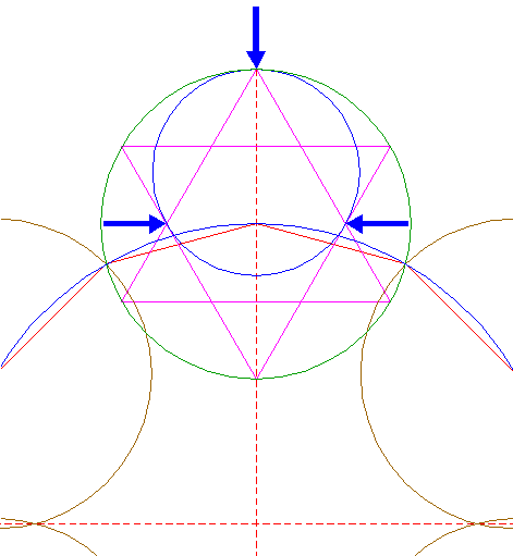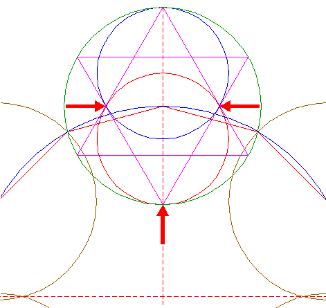 | Construct a circle, passing through the lower angular point of triangle 5 pointing down, and passing through the intersections of the lefthand and righthand sides of both triangles 5. (Circles 6 and 7 make up a Vesica Pisces). |