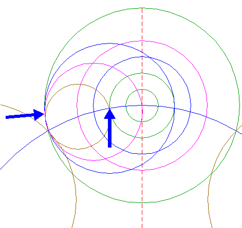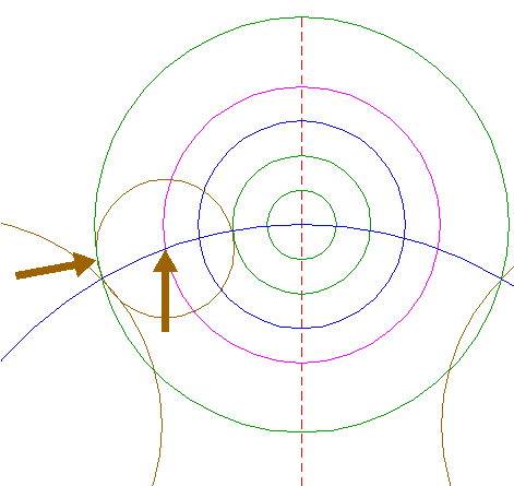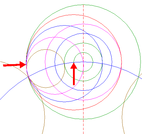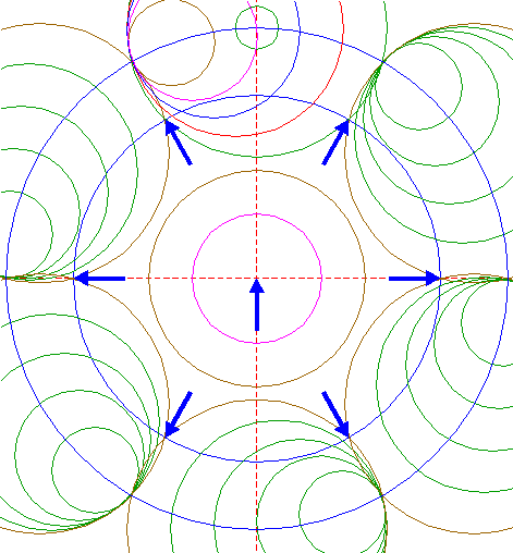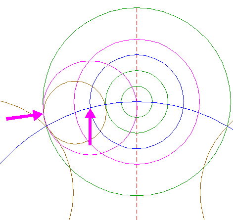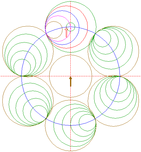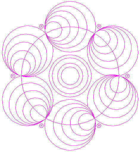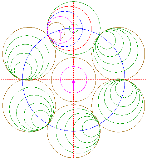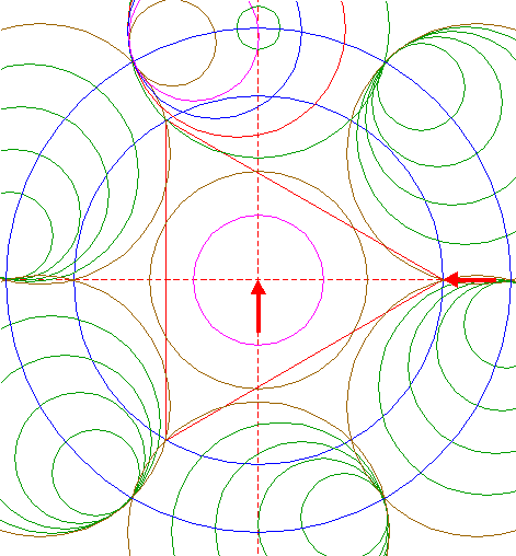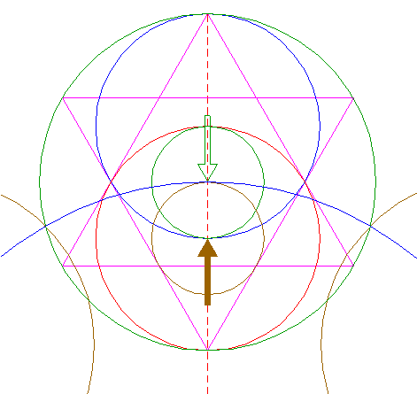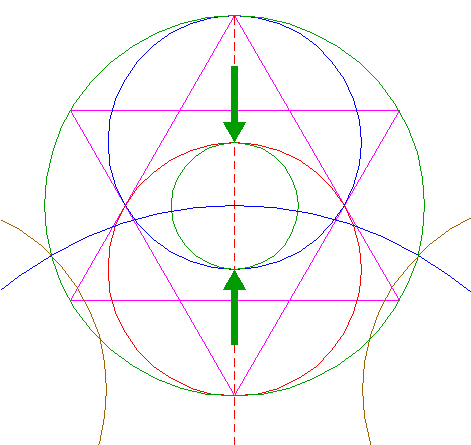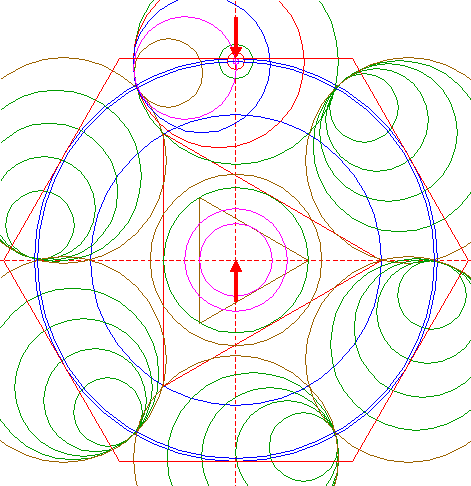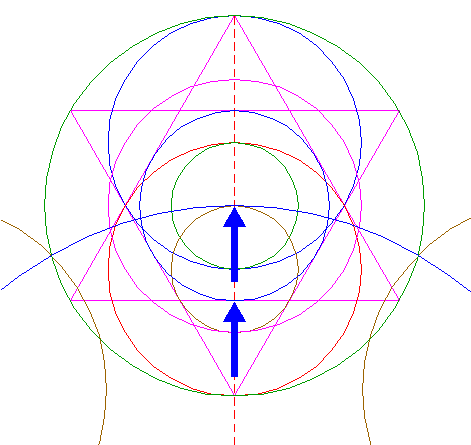 | Construct a "two-points" circle, defined by the end-points of a centerline, one of which coincides with the upper intersection of circle 7, the other with the lower intersection of circle 6, both with the vertical centerline. (Radius of this circle is one third that of circle 3). |