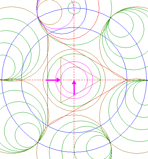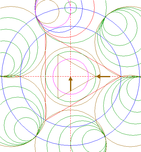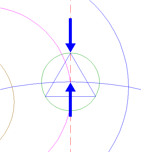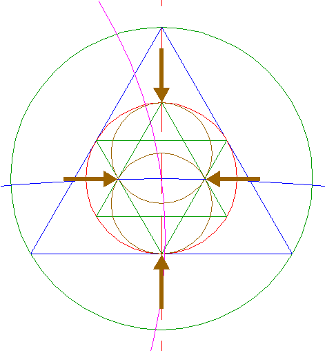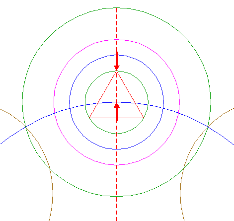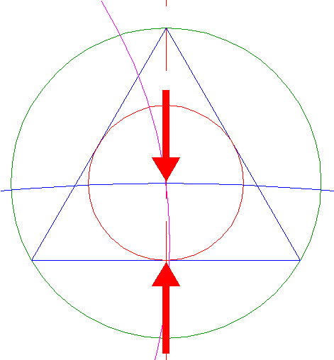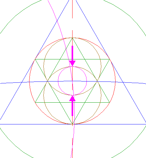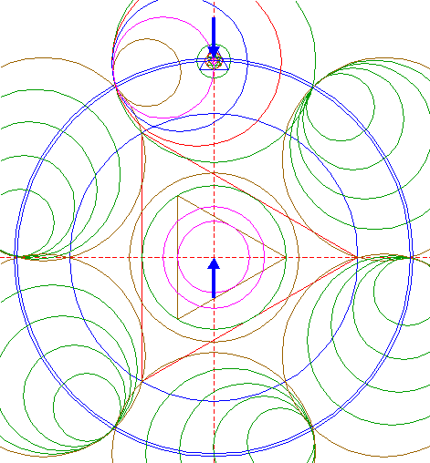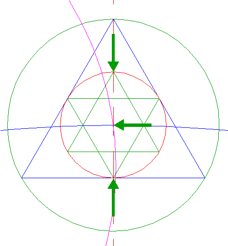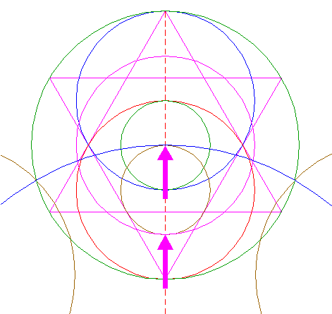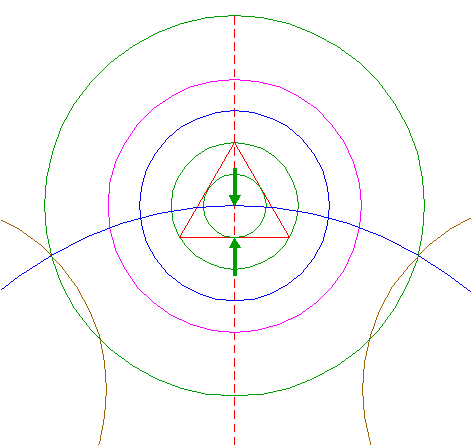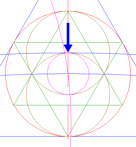 | Construct a circle, passing through the top of triangle 5 pointing up, and passing through the intersections of the lefthand and righthand sides of both triangles 5. |
