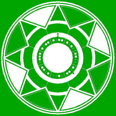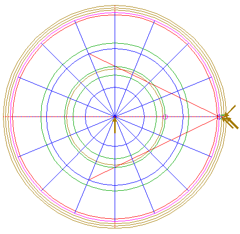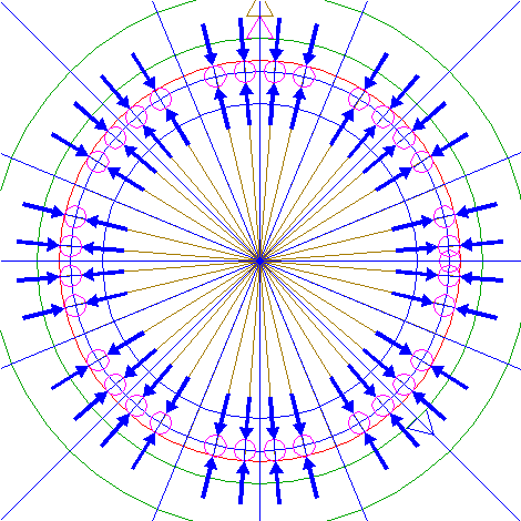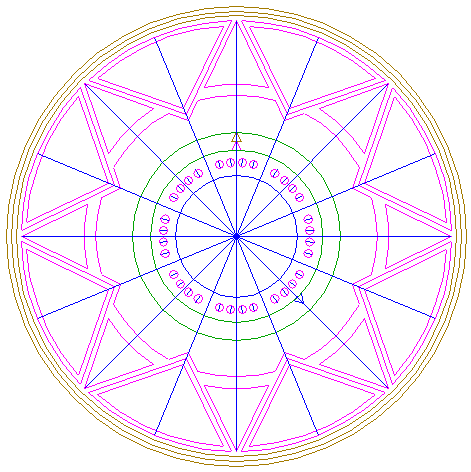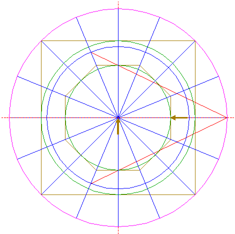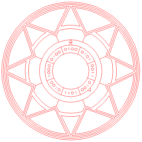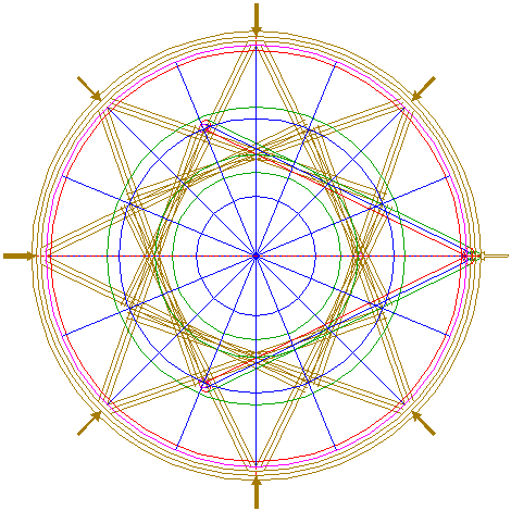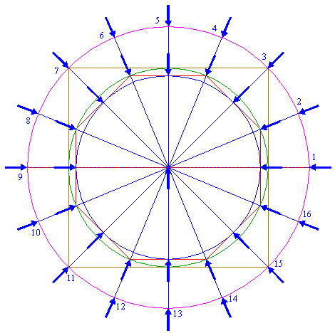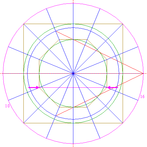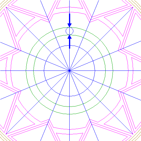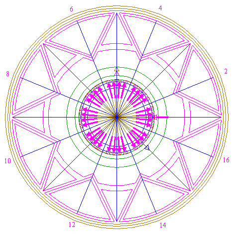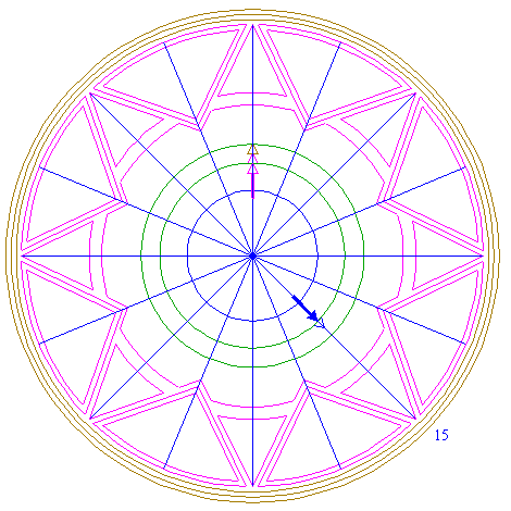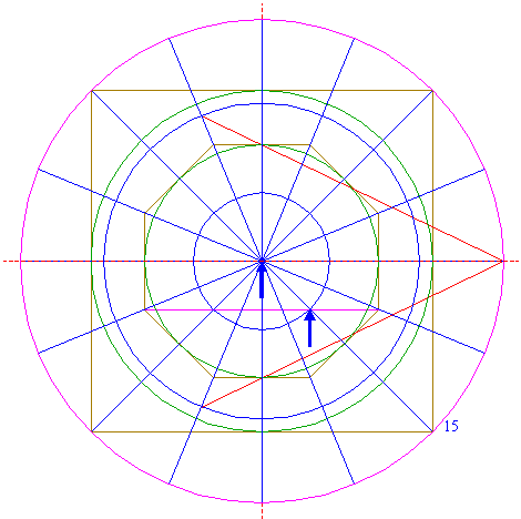 | Draw sixteen rays from the center of circle 1 to the angular points and to the mid-points of the sides of octagon 2. Extend these rays upto circle 5. Number the rays counterclockwise 1 through 16, starting at the righthand one on the horizontal centerline. |