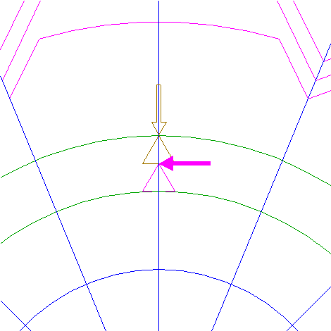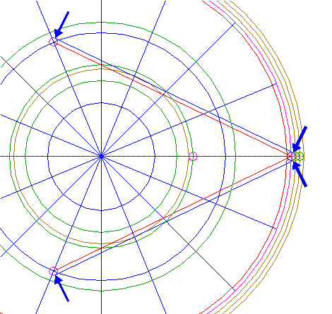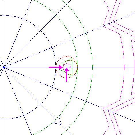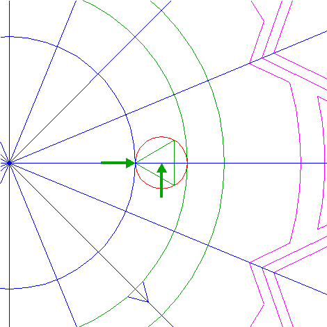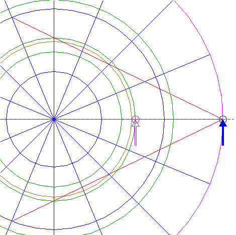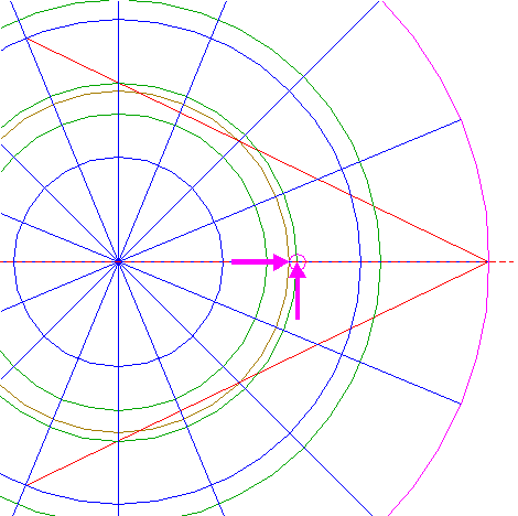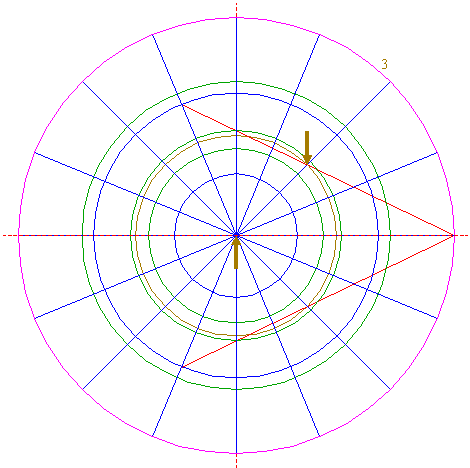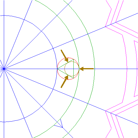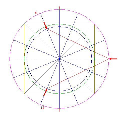 | Draw two lines, from the righthand intersection of circle 5 and the horizontal centerline to the intersections of circle 1 and rays 6 nrs. 6 and 12. |