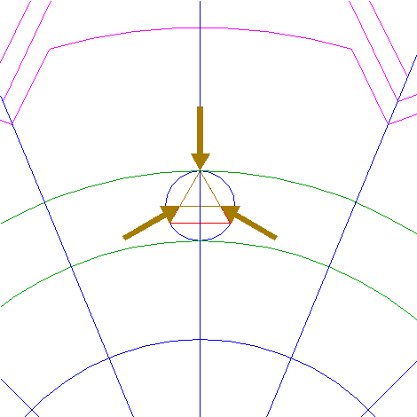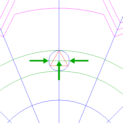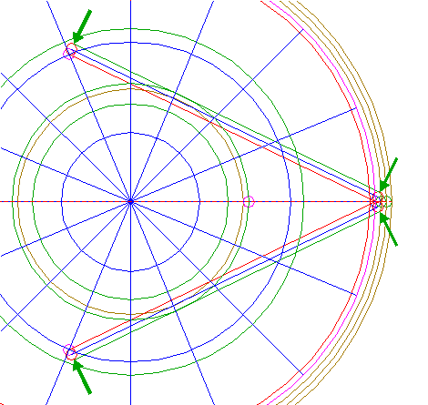 | Copy circle 15 two times, the first one to the righthand intersection of circle 16 and the horizontal centerline, the second one to the corresponding intersection of the first one. |