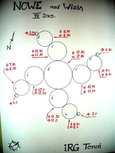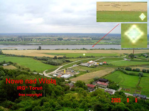 Kręgi w Nowem We wtorek 9 sierpnia ekipa IRG w składzie: Jacek Kozłowski, Leszek Owsiany i Wojtek Budny pojechała na oględziny piktogramu powstałego w miejscowości Nowe (powiat Świecie, 80 km na północ od Torunia na trasie do Gdańska, woj. kujawsko-pomorskie). Jak się okazało na miejscu, formacja powstała miesiąc wcześniej 11 lipca w pszenicy na polu Bronisława Gęsickiego. Pomimo tego zachowana była w dość dobrym stanie, choć wygniecone zboże było już nieco podgnite i porastały je chwasty (fot. nowe f4,) i grzyby (fot. grzyby1). Należy dodać, że w zeszłym roku również dokonywaliśmy oględzin piktogramu, który znajdował się niemal idealnie w tym samym miejscu (fot. Nowe2004). > Pole Pana Gęsickiego znajduje się w starorzeczu Wisły, miejscu, które dość często otulają mgły, jednak według relacji świadka elementem wyróżniającym (prawdopodobnie w momencie powstawania kręgów) b yło to, że tym razem mgła osnuła jedynie niewielki obszar, na którym w następstwie zauważony został piktogram. Mieliśmy również okazję wejścia na miejscową wieżę ciśnień i podziwiać piękno okolicy (fot.z wieży; z obiektem). Według relacji strażnika wieży, kręgi zbożowe w Nowem powstają regularnie od roku 1999, a wcześniej już w pierwszej połowie lat 80-ych !!!