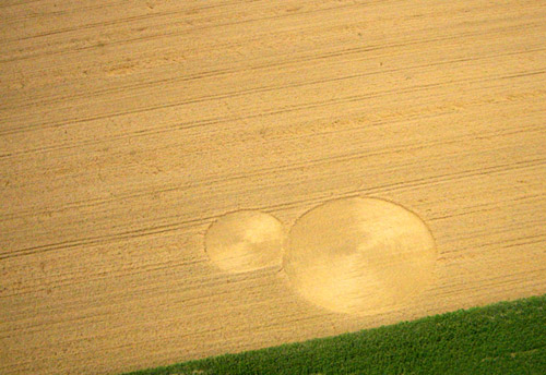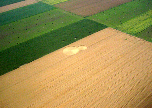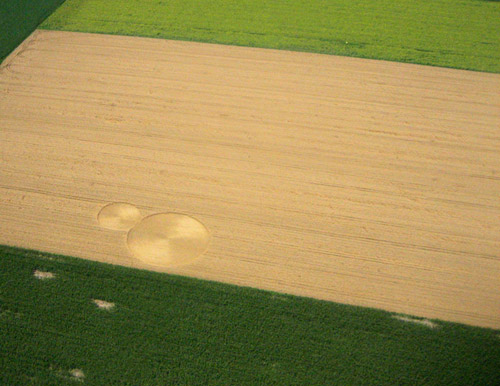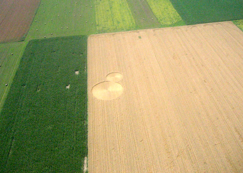 I took pictures of these crop circles near Mezokomarom, Hungary, GPS LAt 46 50 LON 18 18 (roughly) on 9th July. The diameter of the bigger circle is about 33 m, the other is about 18 m. Laszlo Bokor |