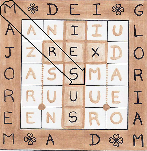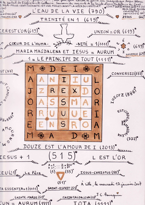 I have been inspired by the wonderful Cross of 7 UFOs which flew over Pensacola, Floride, 14th August 2005 and which has been presented at the Italian TV Rai2 in May 2006 by Mgr Corrado Balducci of the Vatican : http://www.ovni007.com/id122.html The center of my draw is the letter S like Source, Spiritus Sanctus, Saviour, Serpens which is an important symbol of the Christ who regenerates the Humanity. Here the gold colour is a symbol of the Love which generates All. This is the Water of the Life (= l’Eau de la Vie in French) and I have found with the table A=1,…Z=800 : L’EAU DE LA VIE = 790 Please observe that the gold is the chemical element n° 79 : http://fr.wikipedia.org/wiki/Or#Histoire There is a marvellous similarity between the cubic crystalline structure of the gold and my draw in one hand and the crop circle of Madison Ville in the other hand http://www.cropcircleconnector.com/inter2007/USA/USA2007.html : http://fr.wikipedia.org/wiki/Image:Cubic-face-centered.png The Water of the Life, the Divine Gold circulates everywhere like a snake. My draw is also a circulation of the letters IESUS-NAZARENUSREXIUDAEORUM. Please observe that there is here something miraculous: the circulation may continue like this : IESUS-NAZARENUSREXIUDAEORUMARIAMOU-RIESUS-NAZ(ad vitam aeternam… MARIAMARIAM = Maria MagdalenaAMOUR = LOVE in FrenchThen, the Gold symbolises also here the Union between Jesus and Maria Magdalena, the Union between the Sky and the Earth ! (see also my other Gematrie works about the gold : L’OR, AURUM in my draw) The reasons why the crop circles authors have chosen Madison Ville to answer my draw are very clear : “The first major gold mining sites in the state also are in Monroe County, where placer mining took place along Coker Creek from 1831 to 1834.” http://www.mytennesseegenealogy.com/tn_county/mro.htm (see the chapter “extended history) Furthermore, Jeffrey Wilson has written about the crop circle of Madisonville : “The area surrounding Madisonville is quite interesting for a number of reasons. From looking at a topo map, there are quite a few local place names that give some indication of the local geology and environment: Rocky Spring, Hopewell Springs, Tevis Spring, Reed Spring, Sweetwater, etc… Yes, the area is host to many springs! Also, Craighead Caverns is located next to Madisonville, and between Madisonville and Sweetwater is located a registered US Natural National Landmark called “The Lost Sea” which is a 4.5 acre underground lake in a cavern, claimed to be the largest underground lake in the USA. Yes, the whole area is pretty much all limestone!” and also : “ Just to the south of the Madisonville crop circle site are two additional former Cherokee mound and village sites – the Great Tellico, which was also known to the Cherokee as “the mother city” and Chatuga, its ‘sister’(…) Unfortunately, now nearly all of these ancient town and village sites are completely under water since the Tennessee Valley Authority dammed up the river to create several large lakes.” http://www.cropcircleconnector.com/inter2007/USA/USA2007.html The formation of Madisonville is approximately 157 feet in diameter (square). 157=78+1+78 and 78+1=79=Au=Gold. The crop circle authors point out the symbol of the Gold at the centre of the formation. This represents the Central Sun, the Source, the Light of the Universal Love, the Love of Jesus-Christ for the Humanity. At the centre of the formation, there is an arrow or a spear which has penetrated diagonally. This symbol refers to the name MARS in my draw which is in the same position as the arrow in the formation. MARS was the roman god of war: http://en.wikipedia.org/wiki/Mars_%28mythology%29.