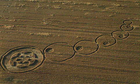 A 700' "thought bubble' type formation in wheat. Large circle with 6 "rings" (actually interlocking "loops / pathways" coming off of that, and a small circle in 5 of the "rings". Inside largest circle is a pattern that looks somewhat like the "Froxfield Flower" pattern of '94.