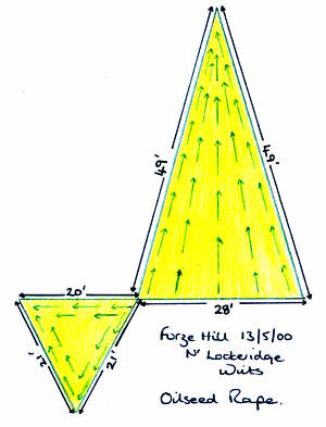 a couple of days old at the most, arrived possible 13/5/00. After walking up a very overgrown tramline we found ourselves in a triangle measuring, 49 - 49 - 28 feet. Coming off one corner is a smaller triangle measuring,21 - 21 - 20 feet. there is some interesting layering but on the most part it is quite simple. For such a simple formation it had a very big feel factor. we felt ourselves rather fortunate to have visited this one. If you can take the pollen attack it is well worth a visit. We will be updating this page with photographs, survey & watercolor ASAP. Charles R Mallett C & F Phenomenon Research |